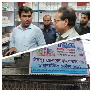চাঁদপুরে জাতীয় ভোক্তা অধিকার সংরক্ষণ অধিদপ্তরের অভিযান। মেয়াদ উত্তীর্ণ রিএজেন্ট পাওয়ায় চাঁদপুর জেনারেল হাসপাতাল ও ডায়াগনস্টিক সেন্টার কে  ১৫ হাজার টাকা জরিমানা।