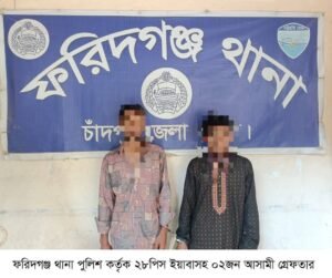 অপরদিকে ফরিদগঞ্জ থানার এএসআই (নিঃ)/ মোঃ জুমায়েত হোসেন জুয়েল সঙ্গীয় ফোর্সসহ  ফরিদগঞ্জের  খারখাদিয়া গ্রামে  অভিযান পরিচালনা করে ১ বছর ৬ মাসের সাজা পরোয়ানাভুক্ত আসামী মোঃ রফিকুল ইসলাম পাটোয়ারী ও সাদ্দাম হোসেন তালুকদারকে আটক করেছে ।