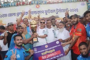 ফাইনাল খেলা শেষে বিজয়ী ও রানারআপ দলের হাতে ট্রফি, মেডেল ও প্রাইজমানি তুলে দেন জেলা প্রশাসক ও জেলা ক্রীড়া সংস্থার সভাপতি মোহাম্মদ মোহসীন উদ্দিন এবং পুলিশ সুপার (এসপি) মুহম্মদ আব্দুর রকিব।
