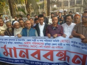এর প্রতিবাদে রোববার বিকেলে চাঁদপুর জেলা প্রশাসক কার্যালয়ের সামনে মানববন্ধন কর্মসূচি পালন করেছে চাঁদপুর বাস-মিনিবাস মালিক সমিতি ও পরিবহন শ্রমিক ইউনিয়ন।