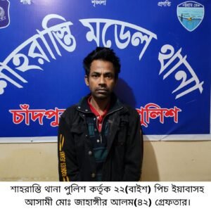 জনাব মীর মাহবুবুর রহমান, অফিসার ইনচার্জ, শাহরাস্তি মডেল থানা, চাঁদপুর এর তত্ত্বাবধানে এসআই(নিঃ) মোহাম্মদ আল আমিন ভুইয়া, এএসআই (নিঃ) মোঃ সাদ্দাম হোসেন সঙ্গীয় ফোর্সসহ থানার একটি চৌকস টিম মাদক উদ্ধার অভিযান ডিউটি করাকালে ০৭/০২/২০২৬ খ্রিঃ তারিখ শাহরাস্তি থানাধীন টামটা দক্ষিণ ইউপিনস্থ টামটা সাকিনের (শিংয়ের বাড়ী) ধৃত আসামী জাহাঙ্গীর এর বসত ঘরের সামনে হইতে মাদক ব্যবসায়ী মোঃ জাহাঙ্গীর আলম (৪২), পিতা- আব্দুল বাছেত মাষ্টার, মাতা- ফিরোজা বেগম, সাং– টামটা (শিংয়ের বাড়ী) থানা- শাহরাস্তি, জেলা- চাঁদপুরকে তাহার নিজ হেফাজত হইতে ২২ (বাইশ) পিচ ইয়াবা ট্যবলেটসহ গ্রেফতার করা হয়।