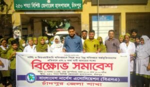 ৪৮ বছরের ঐতিহ্য অগ্রগতির স্বতন্ত্র নার্সিং প্রশাসন,নার্সিং ও মিডওয়াইফারি অধিদপ্তর কে বিলুপ্ত করে ভিন্ন অধিদপ্তরে একিভূত করণের অপচেষ্টার প্রতিবাদে ও ৮ দফা দাবী আদায়ের লক্ষ্যে বাংলাদেশ নার্সেস এসোসিয়েশন ( বিএনএ) চাঁদপুর জেলা শাখার উদ্যোগে বিক্ষোভ সমাবেশ